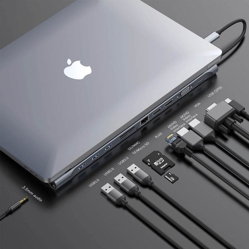 Bővítse a lehetőségeket A többfunkciós netbook dokkoló állomás hozzáférést biztosít az összes olyan porthoz, amelyről naponta hiányzik. Csatlakoztassa USB-C kábellel, és élvezze az intelligens bővítményt kedvére. Multifunkcionalitás A készülék tizenegy porttal rendelkezik: 3 USB 3.0, SD és Micro SD kártyaolvasó, 2 HDMI kábel kimenet, RJ45 hálózati kábel bemenet, VGA kimenet, USB-C (PD) és 3,5 mm-es audio port. A legjobb minőségű kép A VGA port segítségével notebookját csatlakoztathatja a projektorhoz, ami hatékonyan javítja az üzleti megbeszélések minőségét. Két HDMI bemenet akár két eszközt támogat 1080P felbontásban. Nem veszítesz semmit Az USB-C (PD) bemenettel az állomást áramforráshoz csatlakoztathatja, így notebookja folyamatosan 60 W-os teljesítményt kap. Hatékony védelem A készülék egy chippel van felszerelve, amely intelligens működést biztosít, és védelmet nyújt olyan véletlenszerű események ellen, mint a rövidzárlat vagy túlfeszültségTer méktulajdonságok: