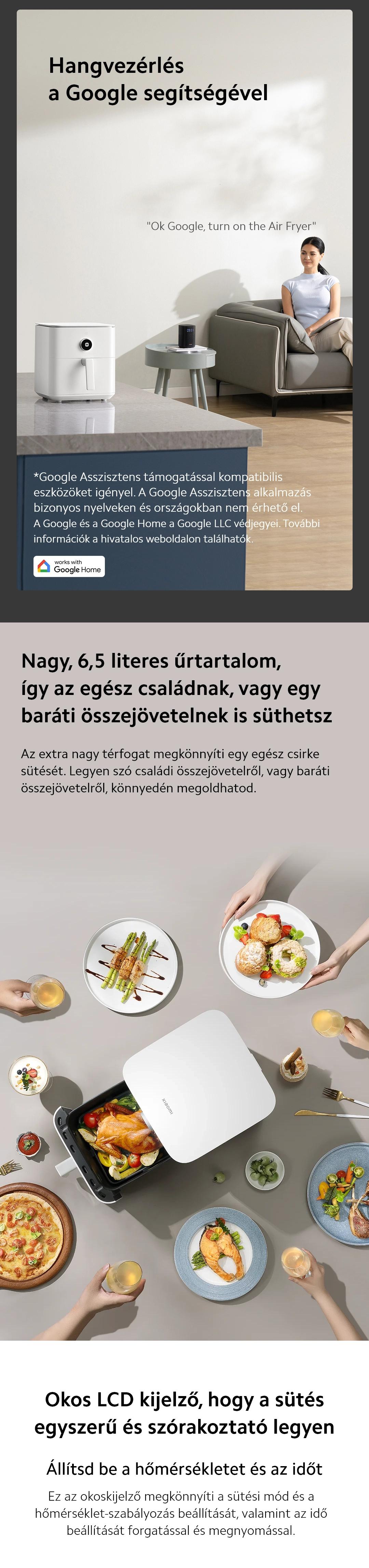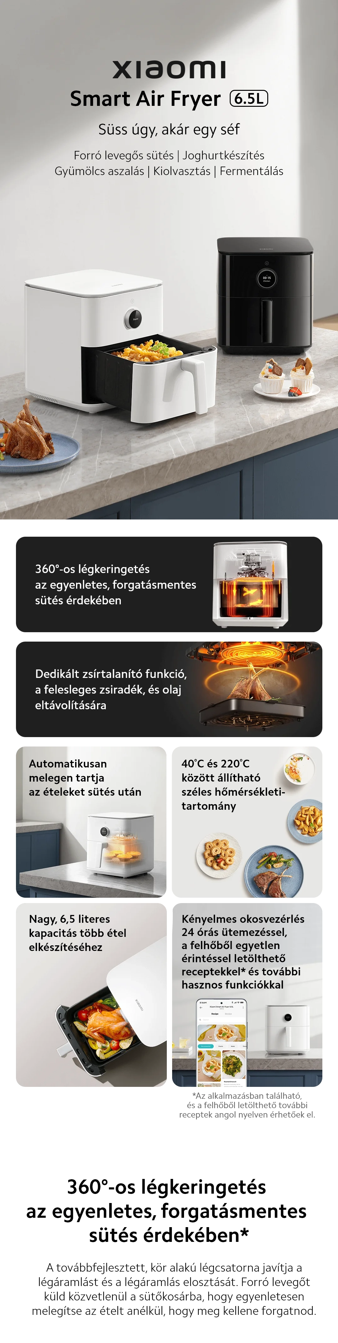 Kompakt méretű, mégis hatalmas, 6.5 literes kapacitású forrólevegős sütő, mellyel az egész család számára süthetsz ízletes, zsírmentes ételeket, okos vezérléssel.