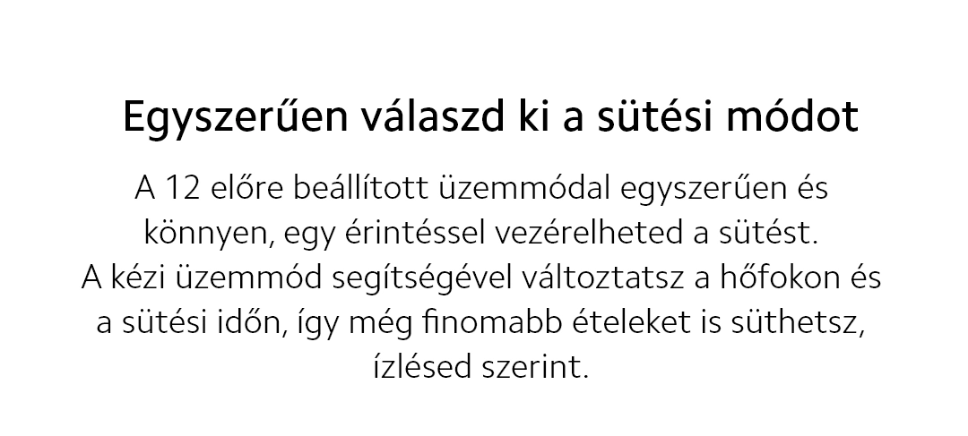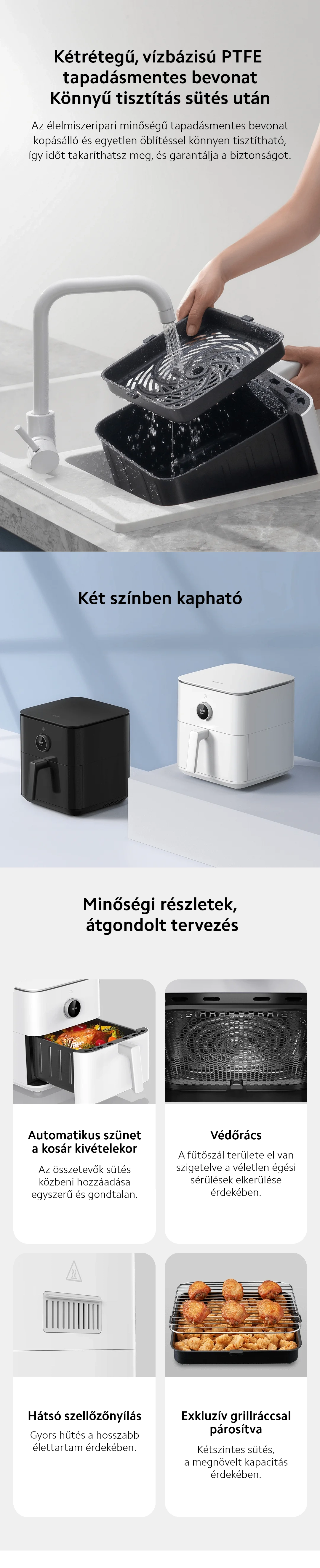 - 40-220℃ között állítható hőmérséklet - A 220°C-os magas hőmérsékleten az étel gyorsabban sül, nem szárad ki, így kívül ropogós, belül szaftos marad.